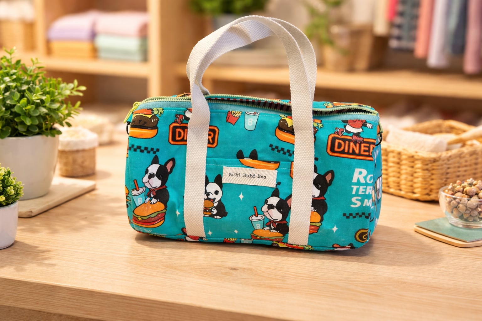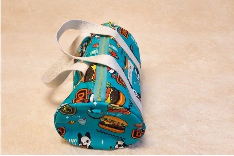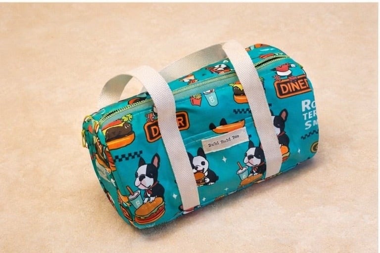 オリジナルデザイン生地で作った、円柱型のボストンバッグです。