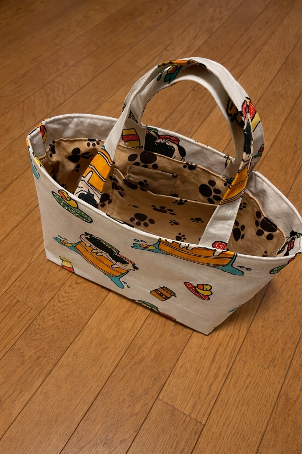 ブヒブヒブーのオリジナル生地『パグ温泉』柄で作ったランチトートです。
